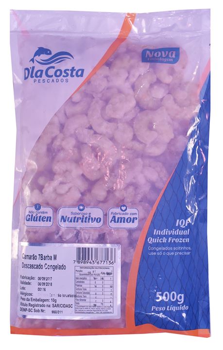 Descrição do Produto: Camarão 7Barbas Desc. IQF Embalagem: 500gCaixa: 15kg / 10kgCódigo de Barras: 7898943677136NCM: 03061790