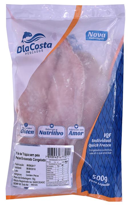 Descrição do Produto:Filé de Tilápia Eviscerado IQFEmbalagem: 500gCaixa: 15kg / 10kgCódigo de Barras: 7898943677211NCM: 03046100