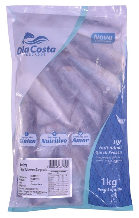 Descrição do Produto: Sardinha Eviscerado IQFEmbalagem: 1kgCaixa: 18kg / 12kgCódigo de Barras: 7898943677129NCM: 03035300