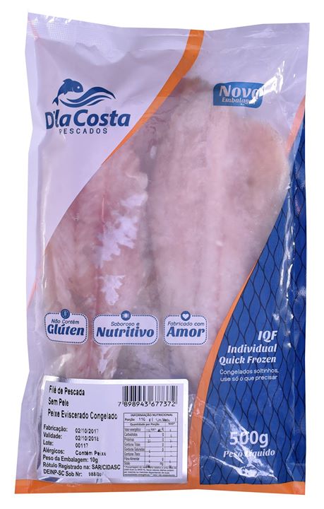 Descrição do Produto: Filé de Pescada Sem Pele IQFEmbalagem: 500gCaixa: 15kg / 12kgCódigo de Barras: 7898943677372NCM: 03038920