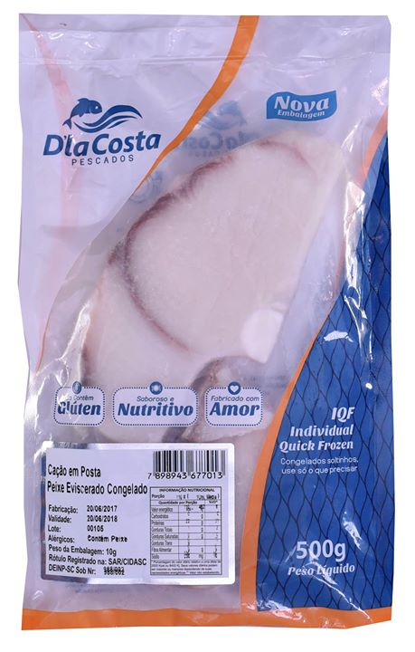 Descrição do Produto: Cação em Posta Eviscerado IQFEmbalagem: 500gCaixa: 15kg / 10kgCódigo de Barras: 7898943677013NCM: 03038114